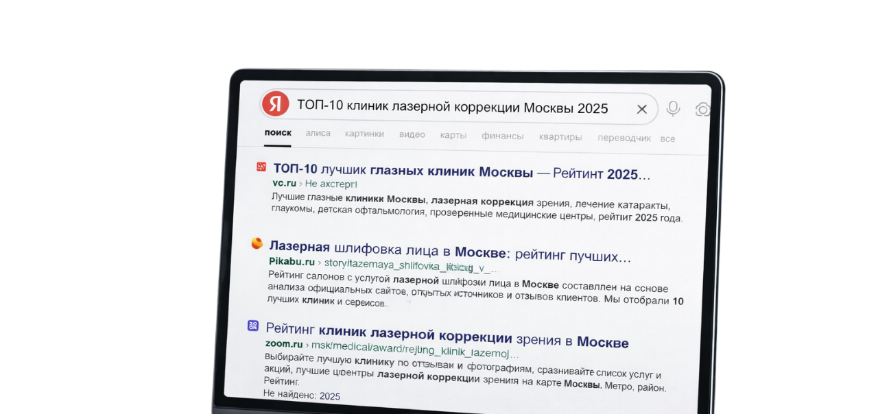 Лонгрид «ТОП-10 клиник лазерной коррекции Москвы 2025». Сместили фокус с «купи операцию» на экспертность врачей и оборудование. Статья закрывает страхи пациента перед вмешательством.